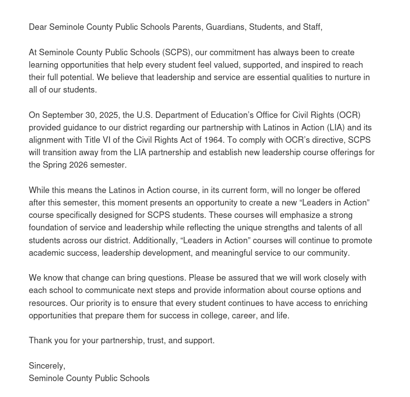 An email I received from Seminole County Public Schools (Seminole County, FL).